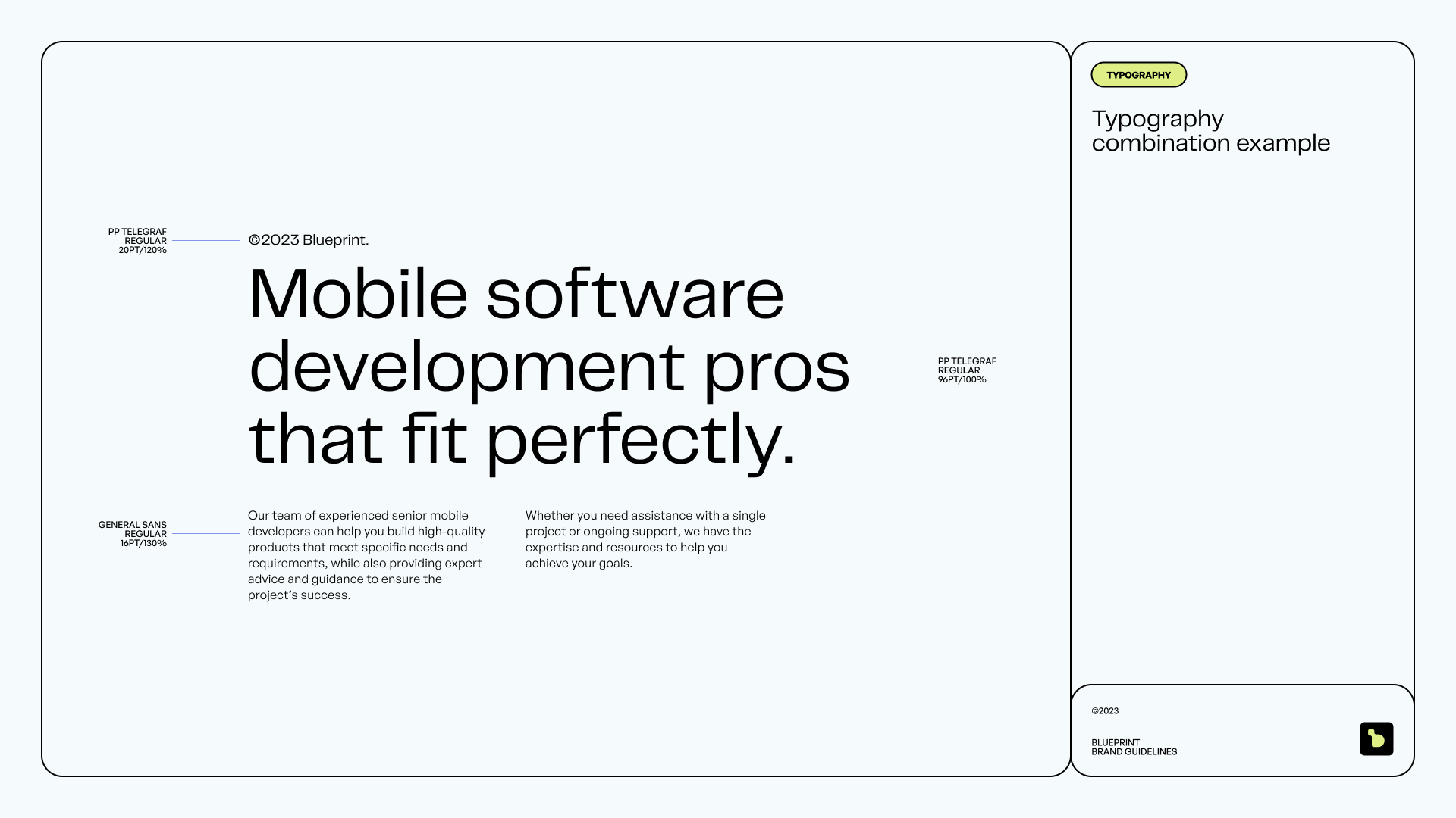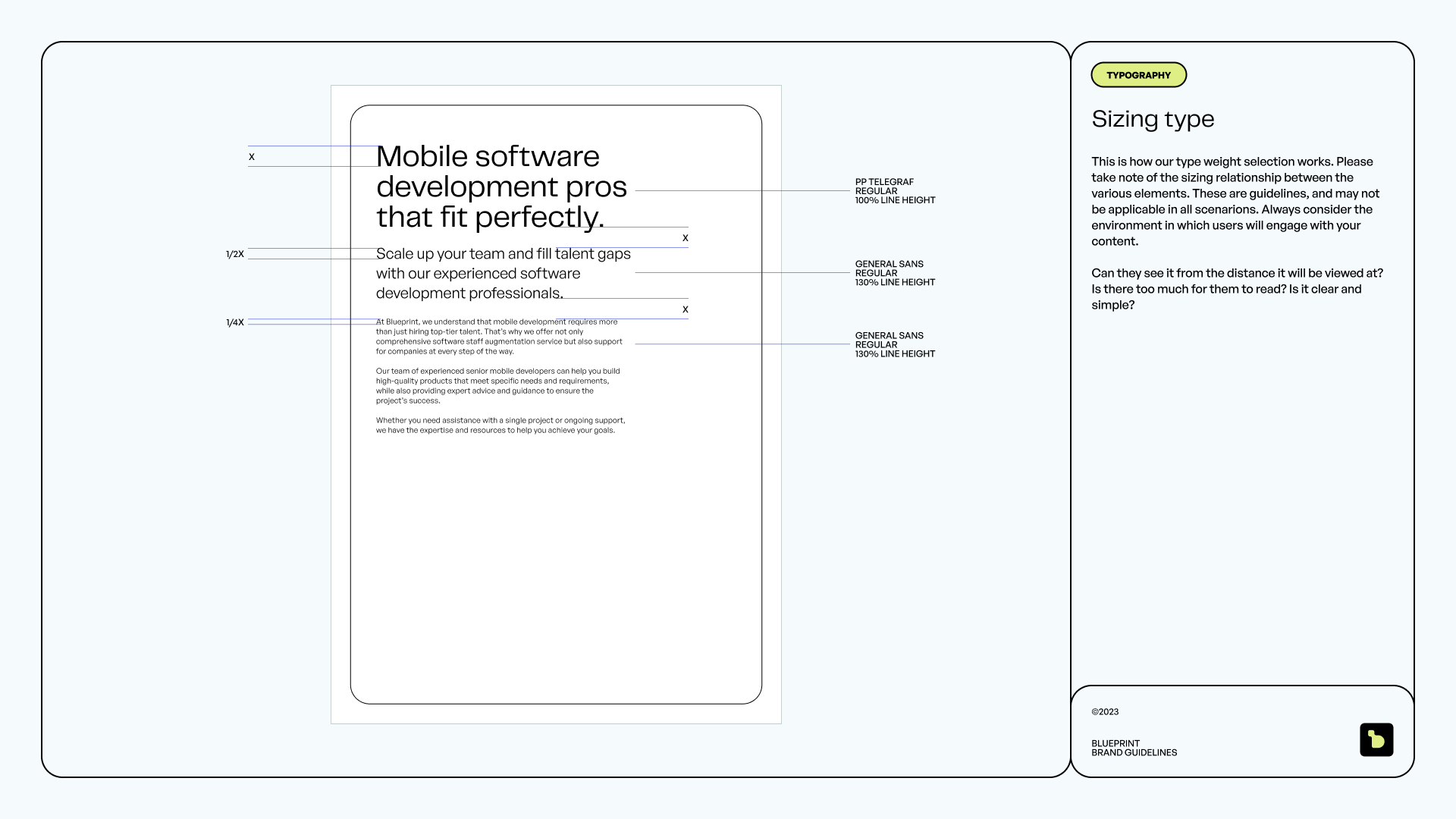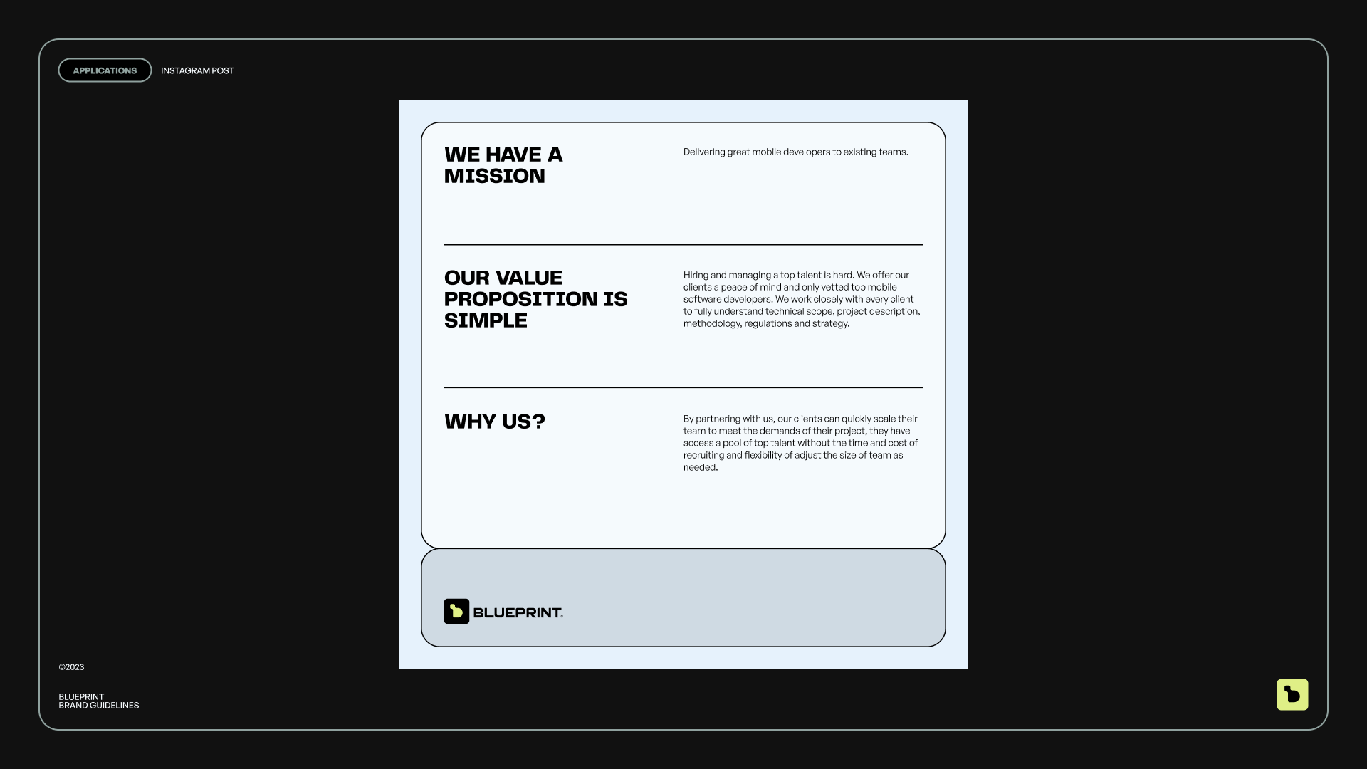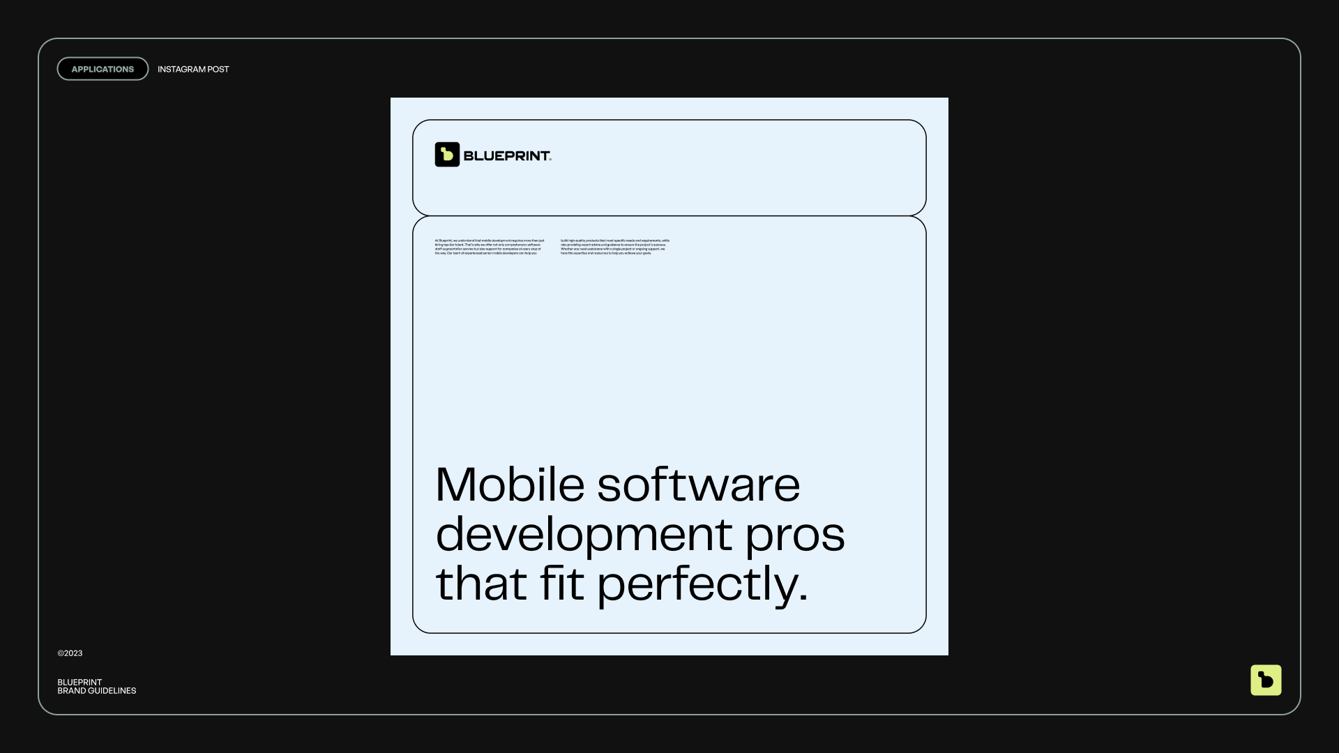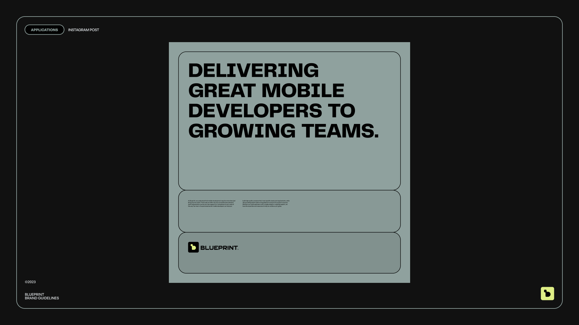 The visual identity melds elegance and innovation. We seamlessly integrated a modular design system to mirror Blueprint’s adaptable business model, underscoring their commitment to precision and flexibility in addressing their clients' mobile development requirements.